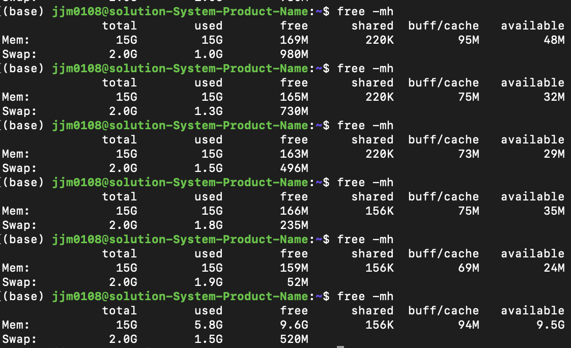 필자의 경우에는, 코드를 돌려보며, 아래 명령어를 반복해 사용했고, 실시간으로 메모리 사용량을 알아보니