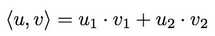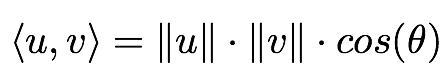 - 단위 벡터(unit vector)로 내적(inner product)를 할 경우에는, 위 식에서 각각 u,v의 길이가 1이기 때문에 단순히 아래의 식으로 요약 가능하며, 계산값의 범위는 [-1,1] 사이가 된다