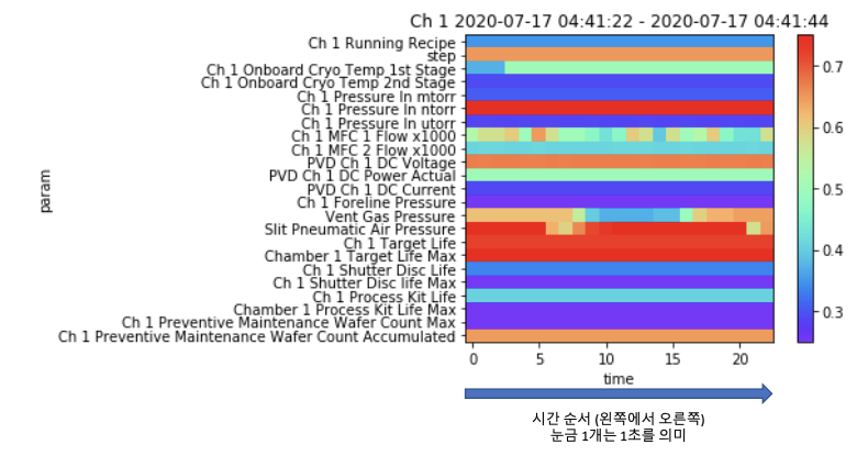 - 해결방안 : 이미지 사이즈를 맞춰야 하는 경우에는 빈 부분을 디폴트값으로 채워도 좋을 것으로 예상됨(자동적으로 CNN에서 관련 없는 feature는 제외시킬 것 챔버로 나누지 않고 묶어서 이미지 인코딩해도 좋을 것 (동일한 시점에서 수집되는 데이터이기 때문에) 예를 들어, 1,2,3,4 챔버는 같은 공정으로 동일한 파라미터를 수집 (각각 23개) -> 23 * 4 = 92 -> 4개의 챔버 데이터의 92초동안의 데이터를 하나의 이미지로 인코딩 가능 혹은, 상관없이 사용되는 모든 챔버 1,2,3,4,C,D, Bu 등)의 데이터를 하나로 묶음 -> 100개 이상의 파라미터가 한번에 처리될 수 있을 것으로 예상